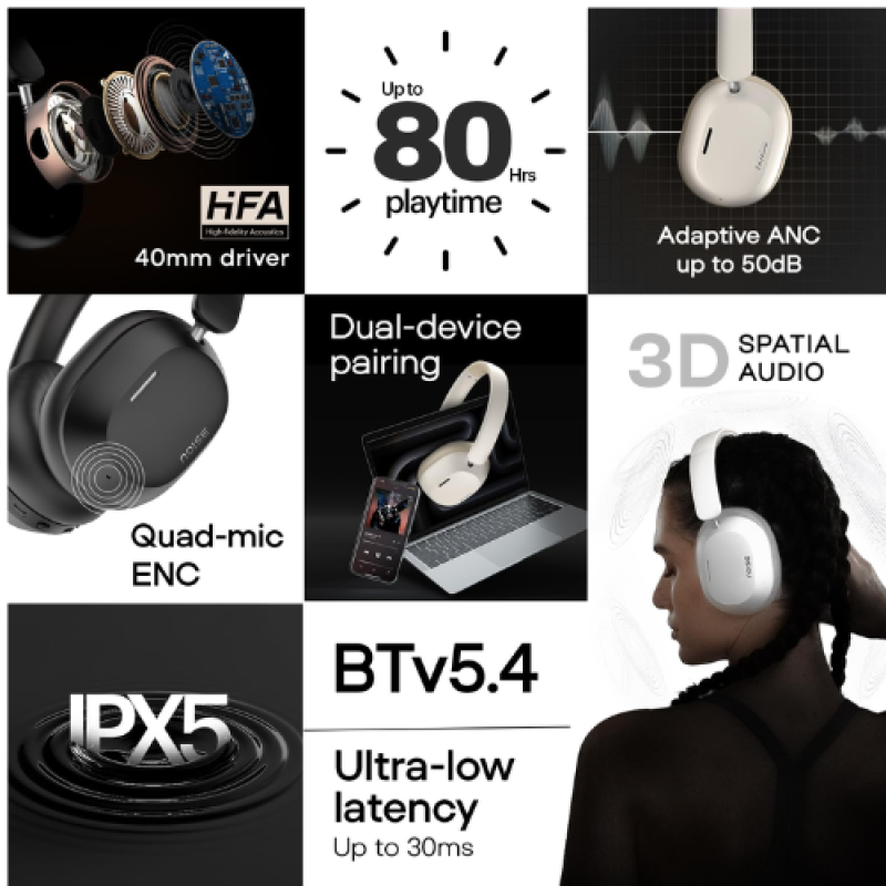 Noise Newly Launched Airwave Max 5 Wireless Over-Ear Headphones with Adaptive Hybrid ANC (up to 50dB), HFA Tech, 80H Playtime, Dual Pairing(Calm Beige)